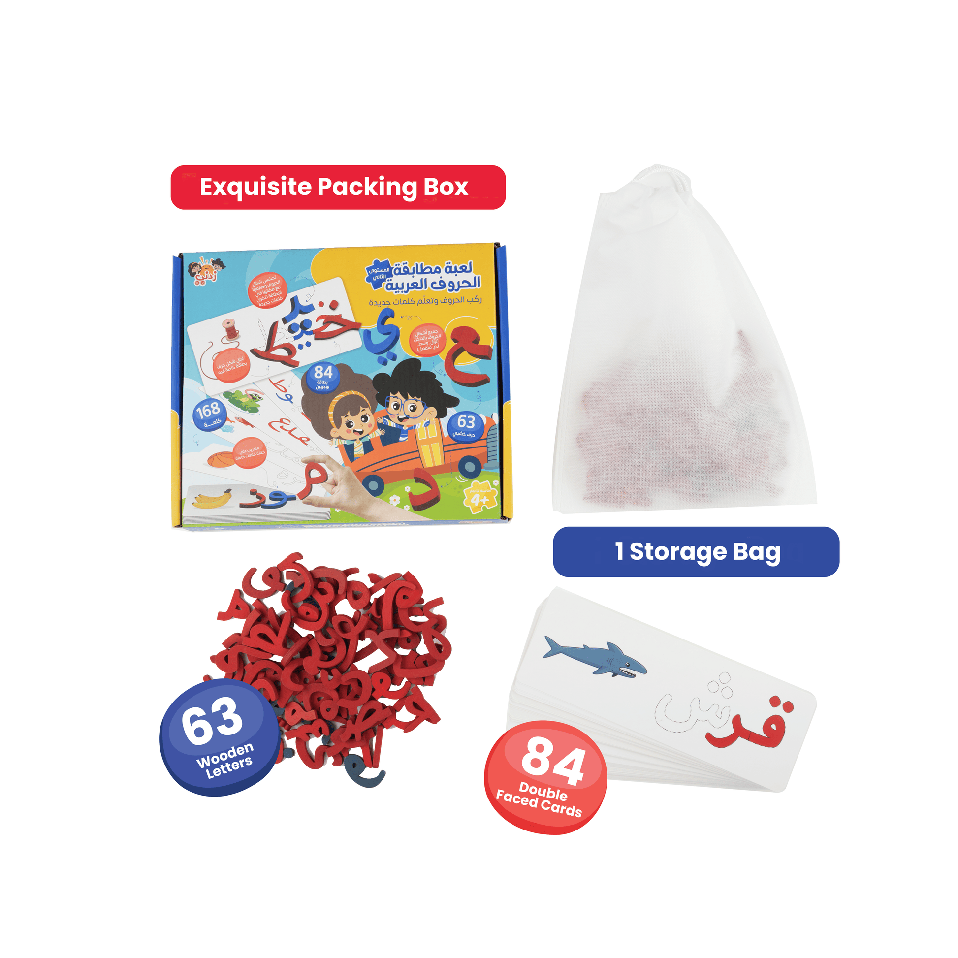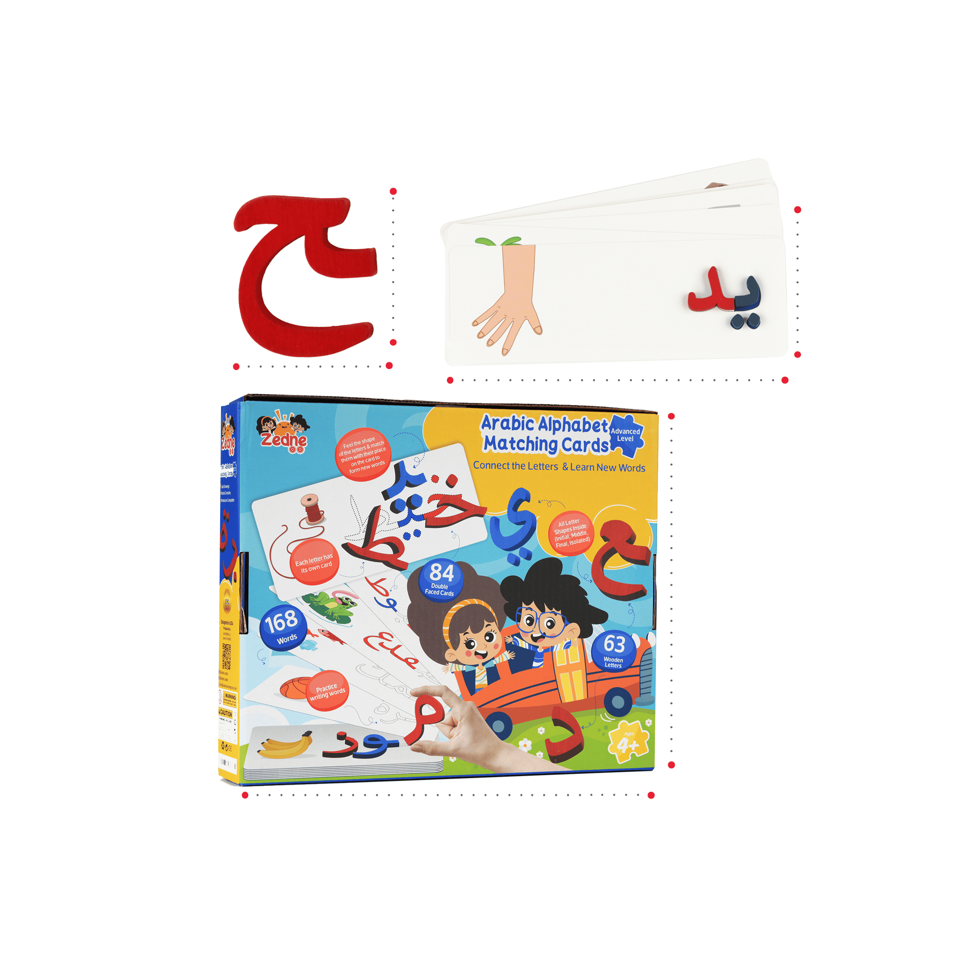 لعبة مطابقة حروف الأبجدية العربية من زدني مستوى متقدم - 63 حرف خشبي - 84 بطاقة ملونة ذات وجهين - تعلم كل حروف اللغة العربية بكل أشكالها - ركب الحروف على البطاقات وكون الكلمات - عمر 3 سنوات وأكبر