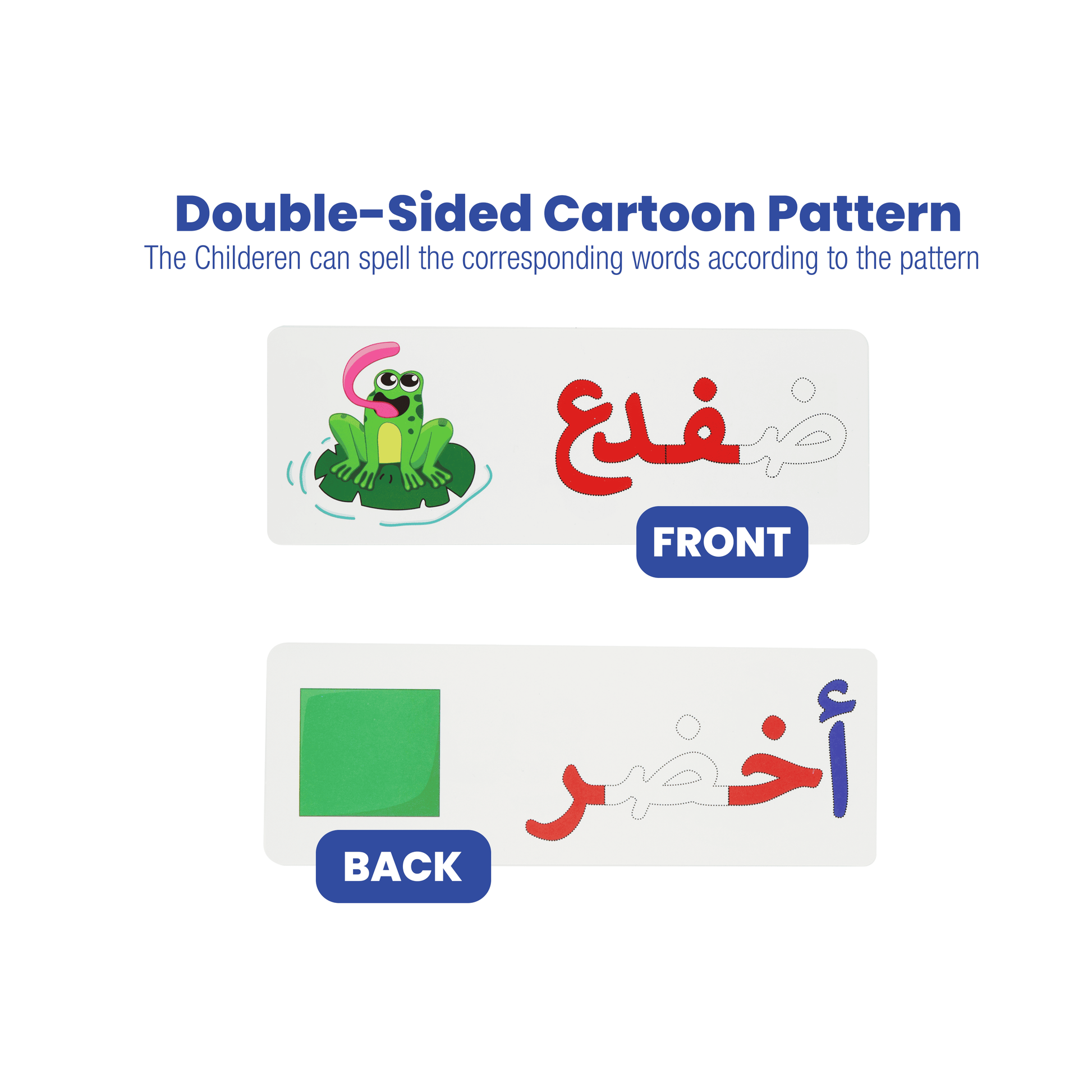- كل وجه مطبوع عليه كلمة حروفها منقطة وبجانبها رسمتها مرسومة بطريقة جذابة