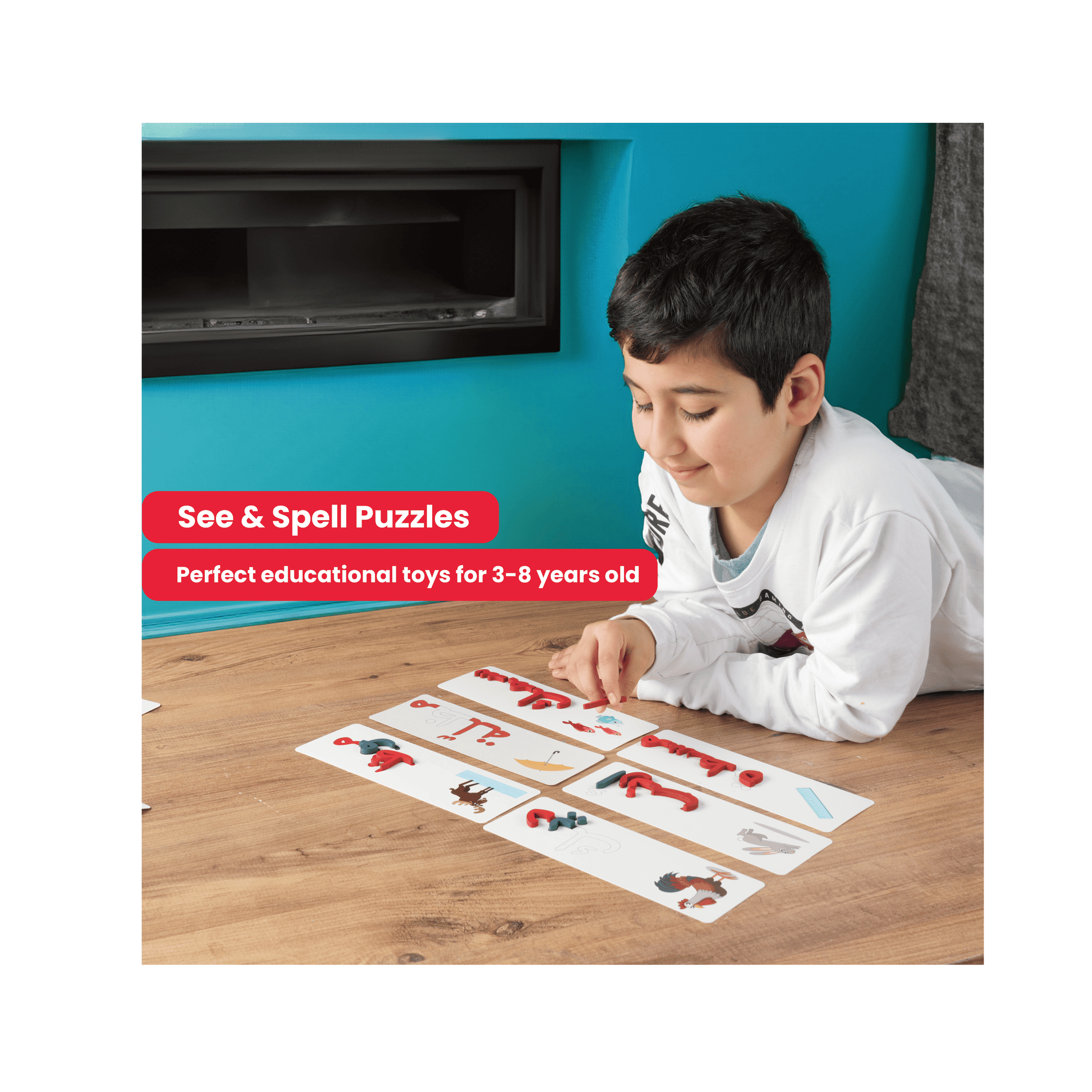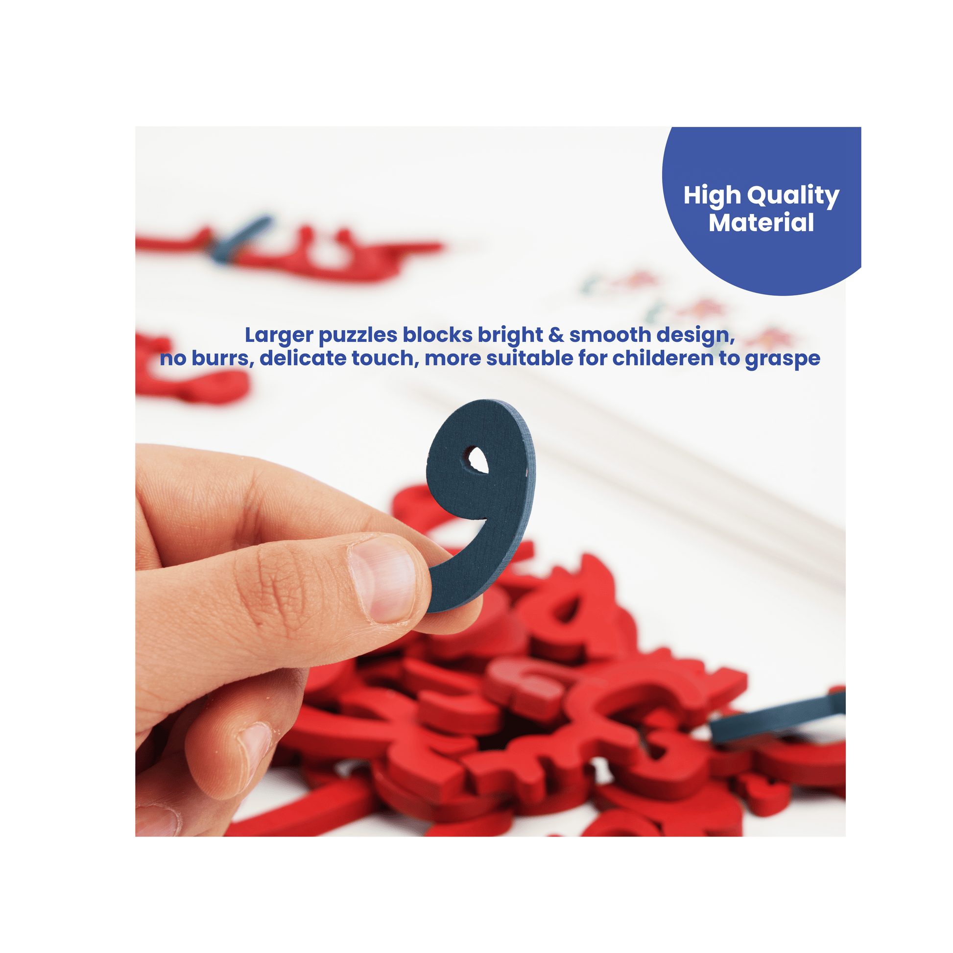 - البطاقات مصنوعة من كرتون مقوى متين يدوم طويلاً، والحروف الخشبية ذات حواف ناعمة ومنحنية لتكون آمنة للأطفال.
