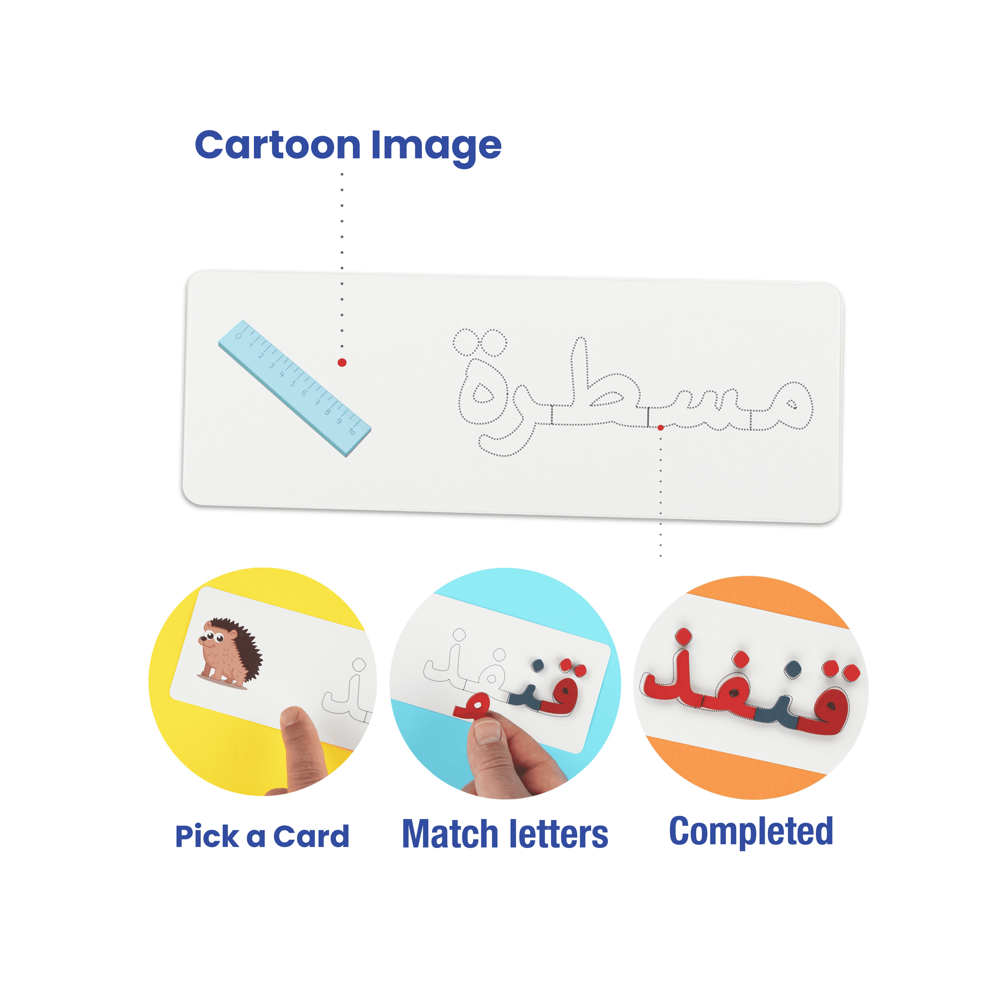 - يركب طفلك الحروف الخشبية على الحروف المنقطة في البطاقات ويكون الكلمات