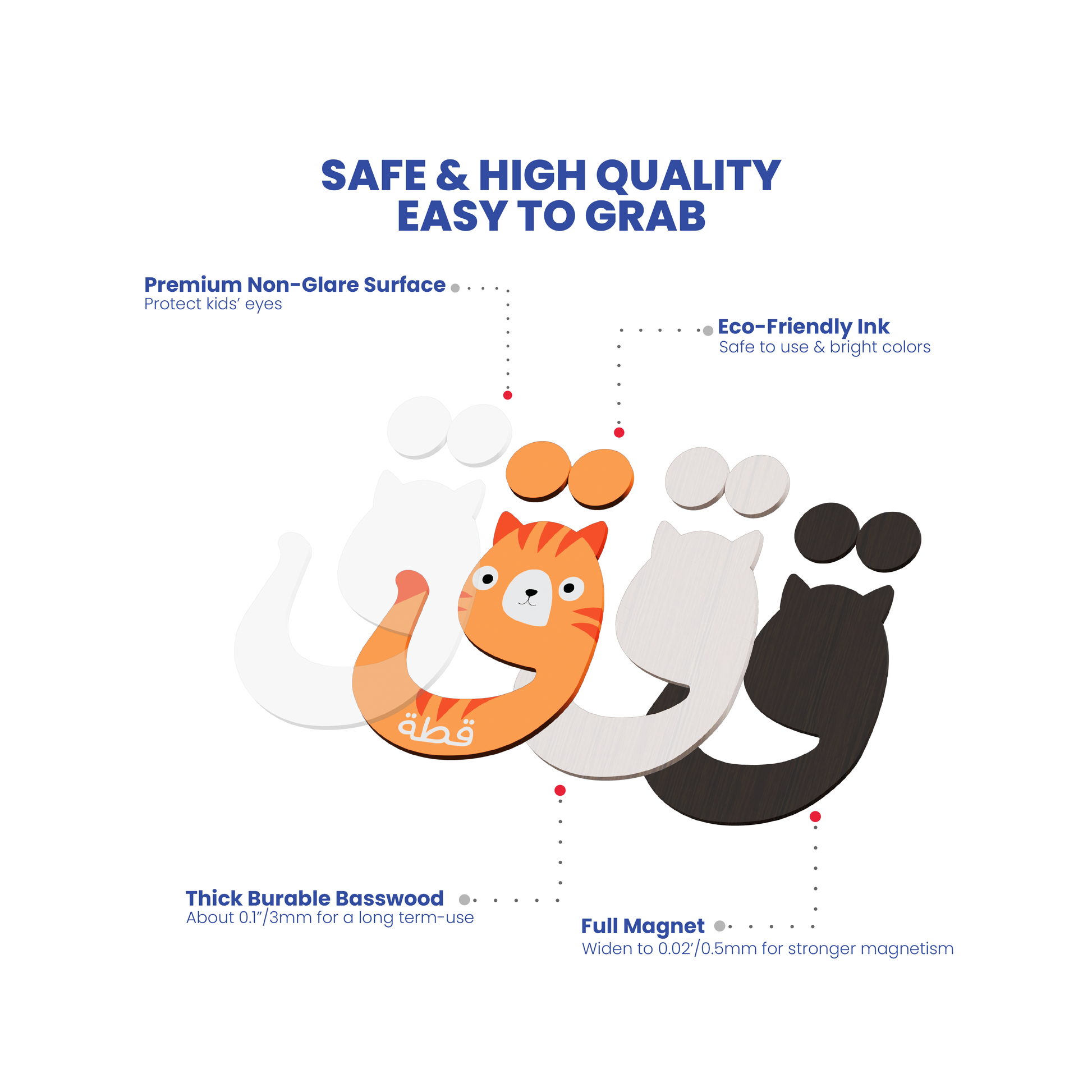 الحروف كبيرة وسميكة مؤلفة من طبقة مغناطيسية تلتصق بكل سهولة على أي سطح وطبقة خشبية سميكة عليها طبقة من طلاء غير عاكس مريح جدًا لأعين الأطفال
