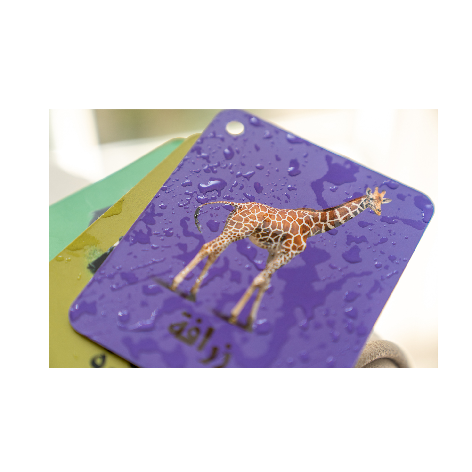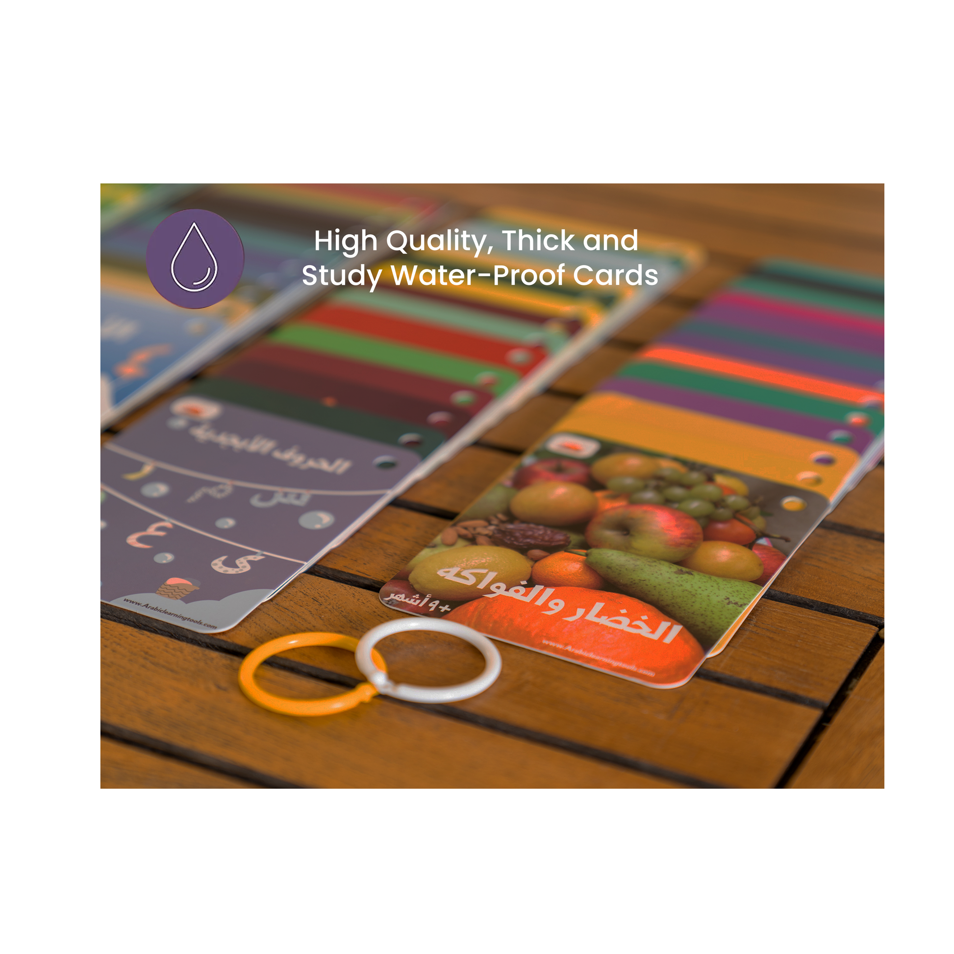 تأتي البطاقات مقسمة إلى أربع مجموعات رئيسية، حيث يمكن لطفلك التعلم من خلال الصور الملونة على الجهتين. كل مجموعة مرتبطة بحلقة تسهل تجميع البطاقات وتجعلها مريحة للاستخدام. الحواف المدورة للبطاقات آمنة للأطفال، كما أنها مصنوعة من مواد مقاومة للماء وآمنة وصديقة للبيئة، مما يضمن تجربة تعليمية مستدامة وممتعة.