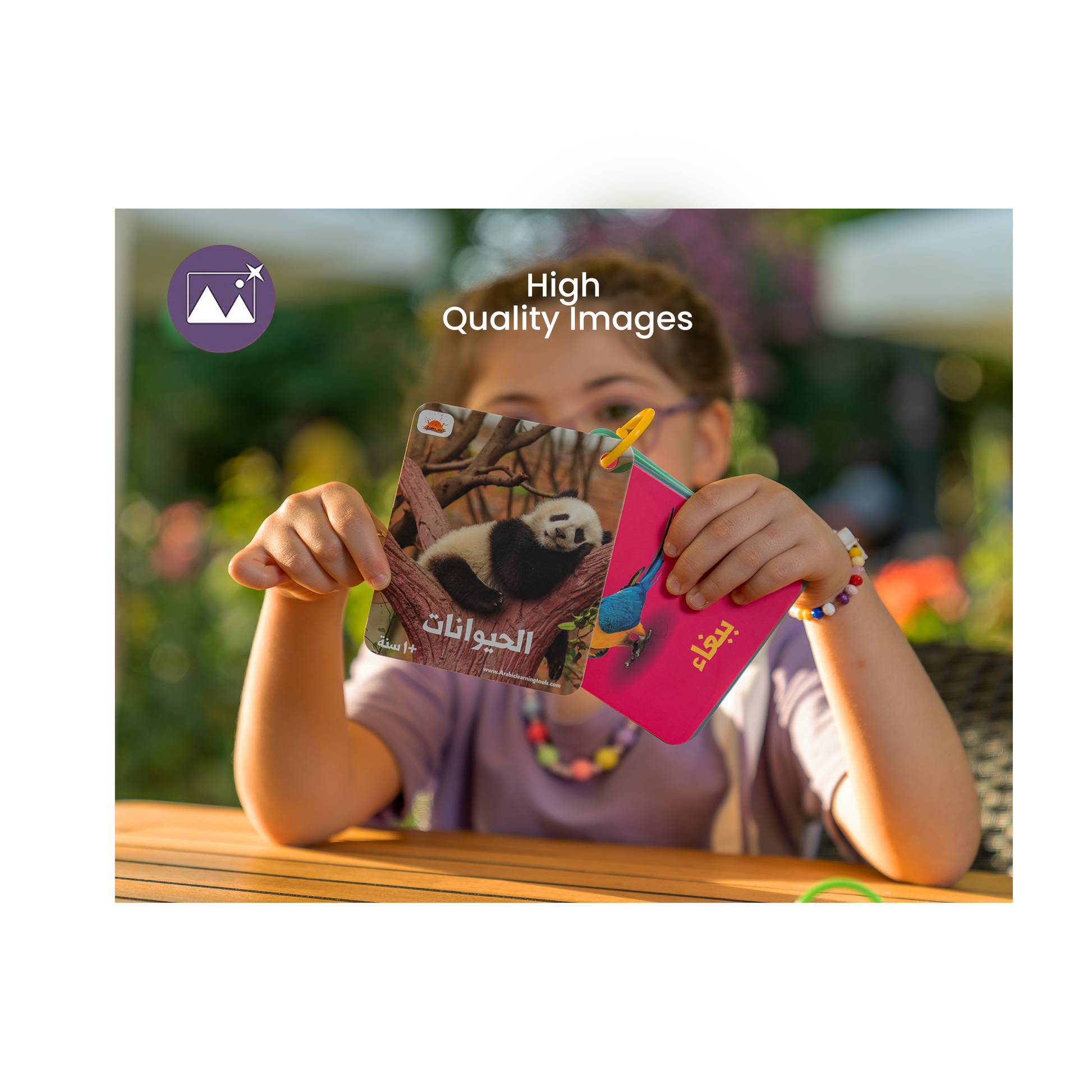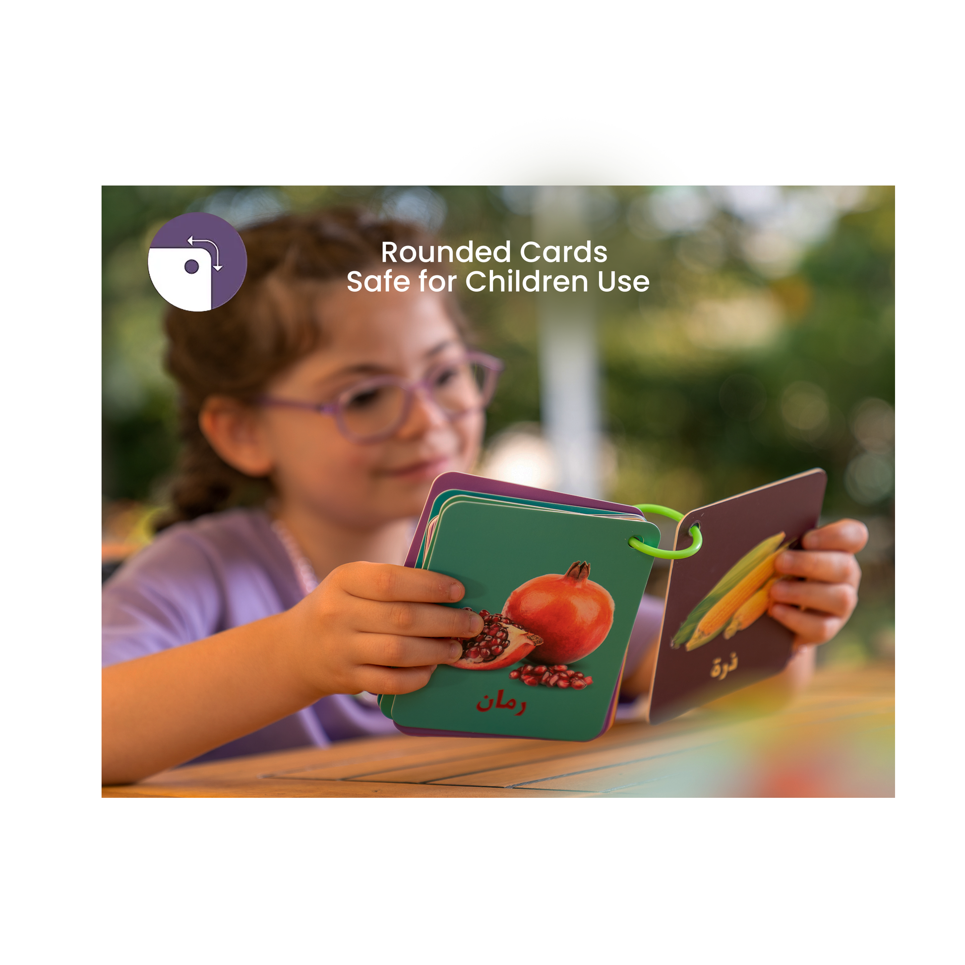 - تصميم عملي وآمن: تحتوي العلبة على 48 بطاقة كل بطاقة لها وجهين، البطاقات مقسمة على أربع مجموعات (الحروف العربية - حيوانات - خضار وفواكه - أرقام من 1 إلى 10)