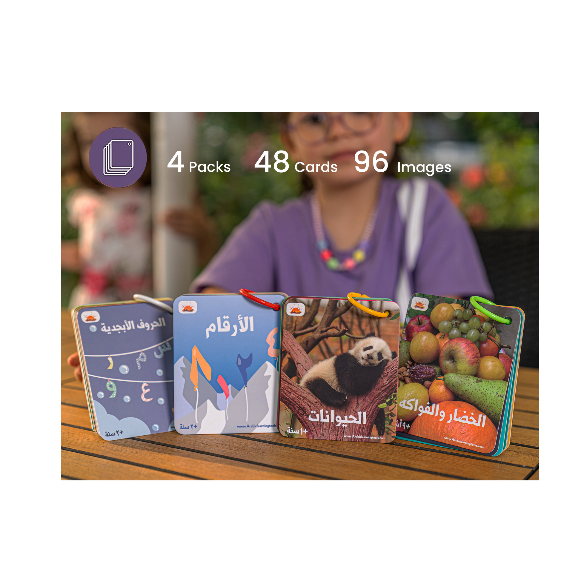 - البطاقات مقسمة على أربع مجموعات (الحروف العربية - حيوانات - خضار وفواكه - أرقام من 1 إلى 10)