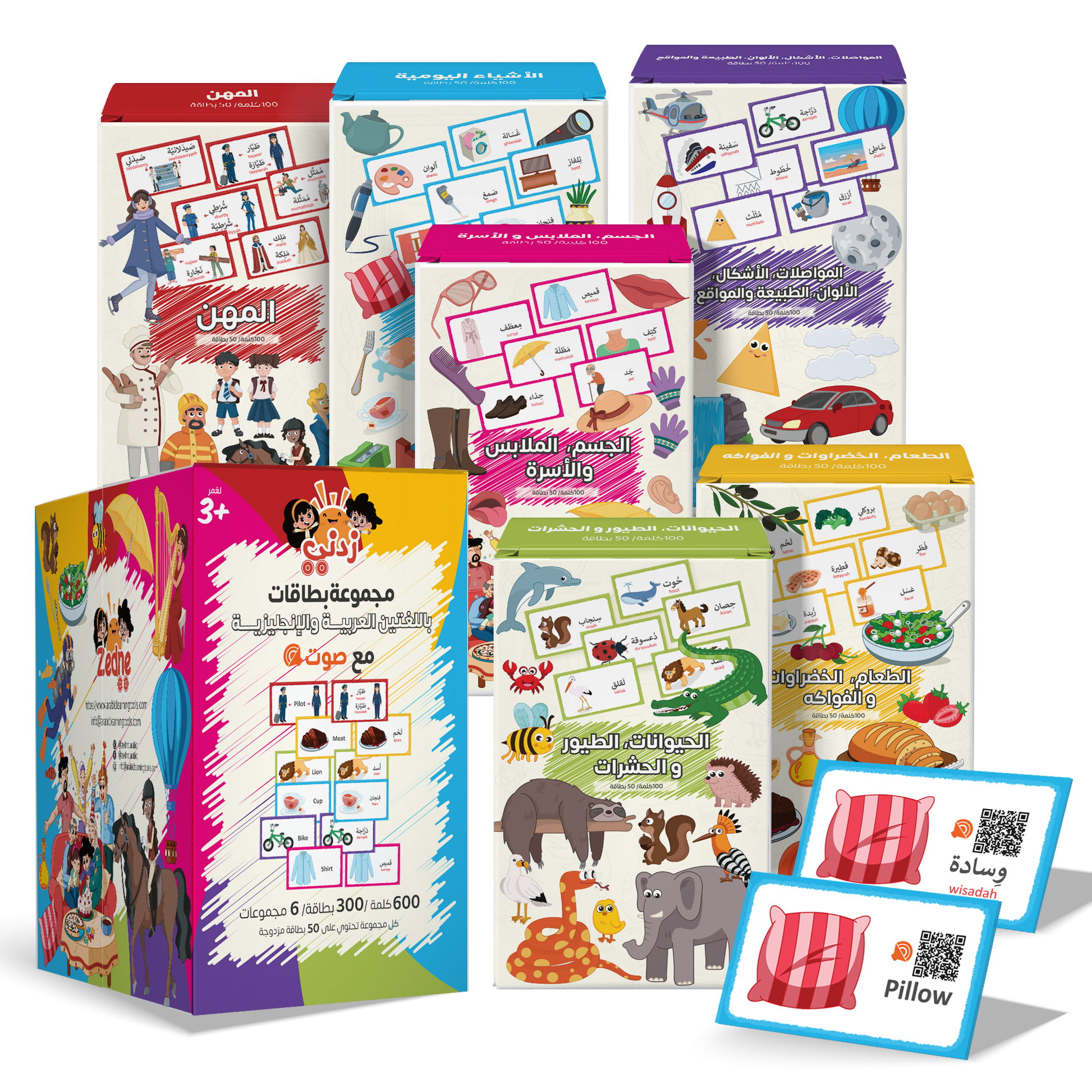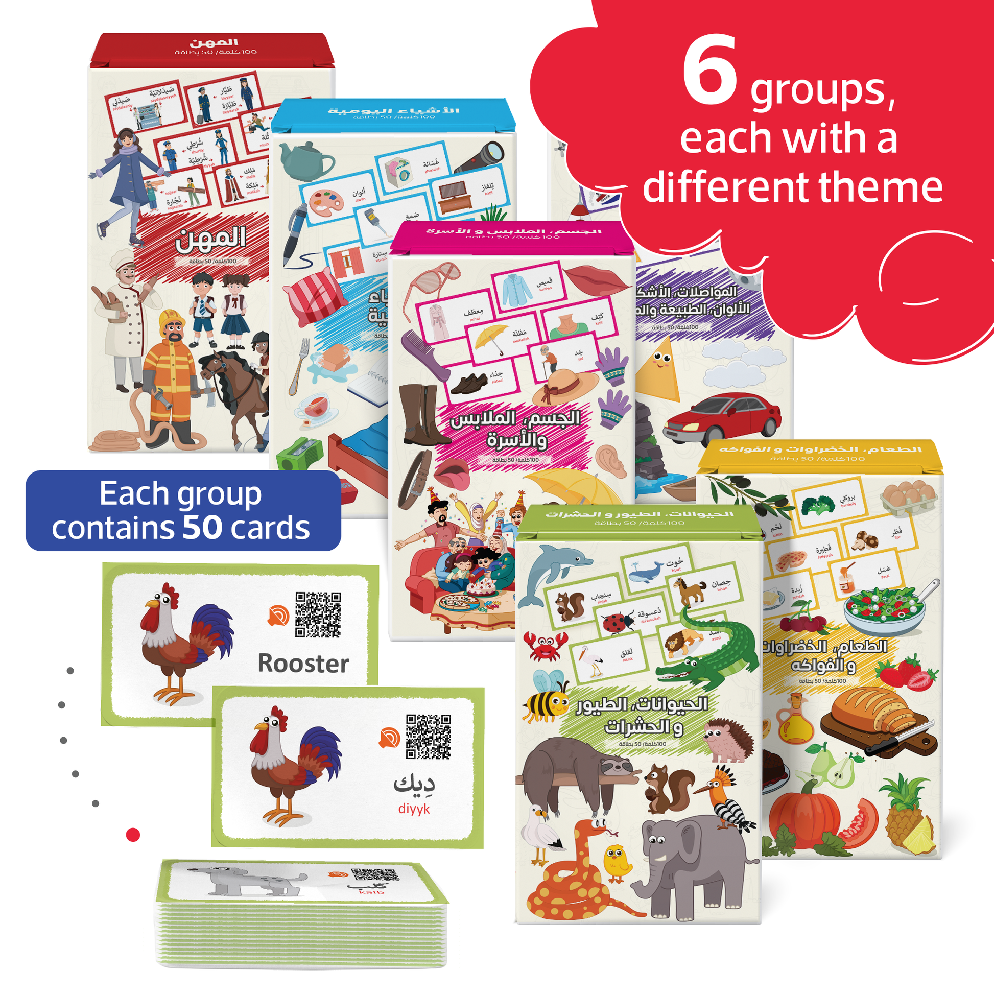 300 بطاقة تعليمية ثنائية اللغة (عربي – إنجليزي) للأطفال مع صور وصوتيات أونلاين | صندوق تعلم ضخم يضم 6 مجموعات لتعليم أسماء الحيوانات، الفواكه، وسائل النقل، والأشياء اليومية | مثالية لتعليم الأطفال اللغة العربية والإنجليزية بطريقة ممتعة وتفاعلية