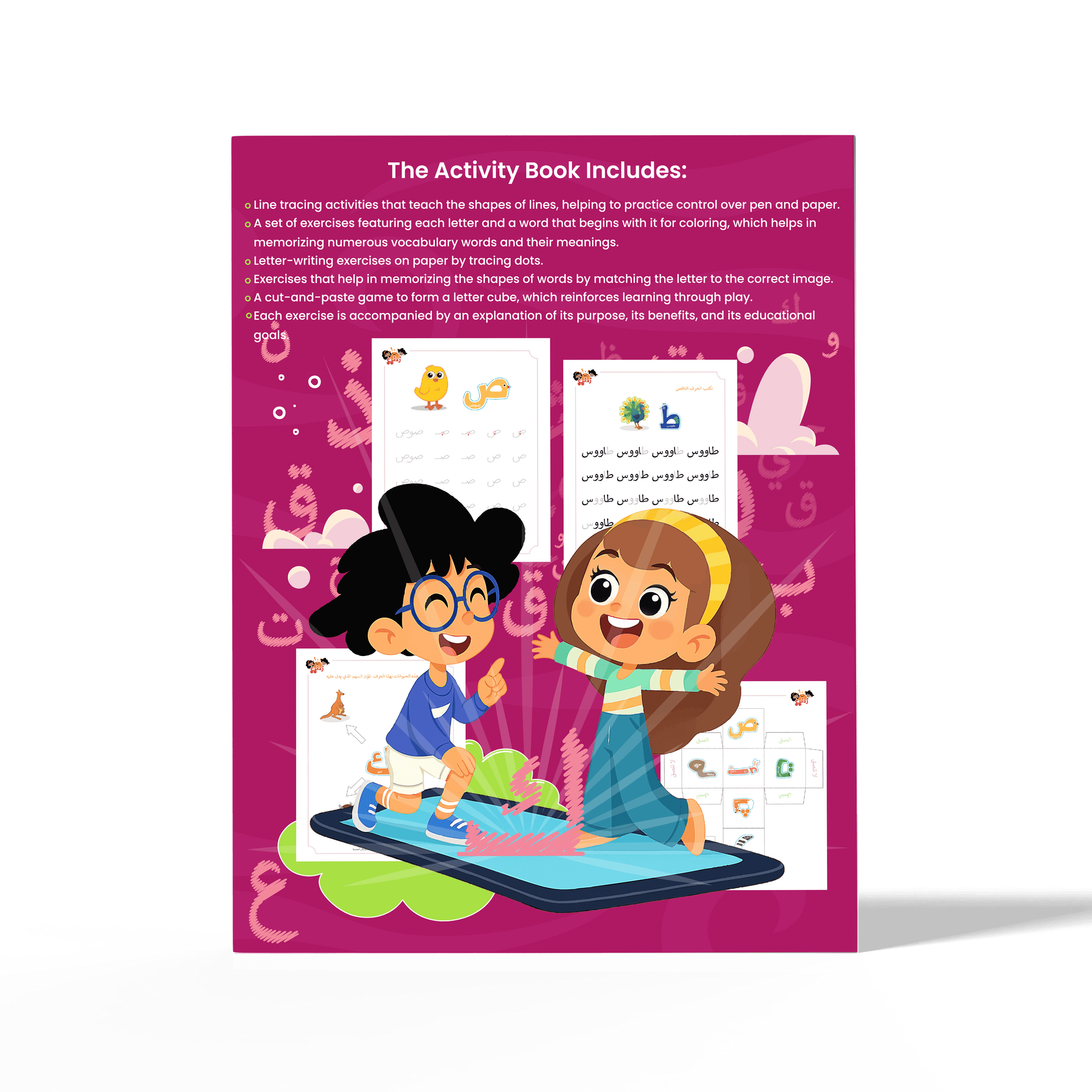 - مجموعة تمارين وصل النقاط، تساعد على كتابة كل حرف بشكله الكامل وفي أول الكلمة بالإضافة إلى اسم الحيوان الذي يبدأ به