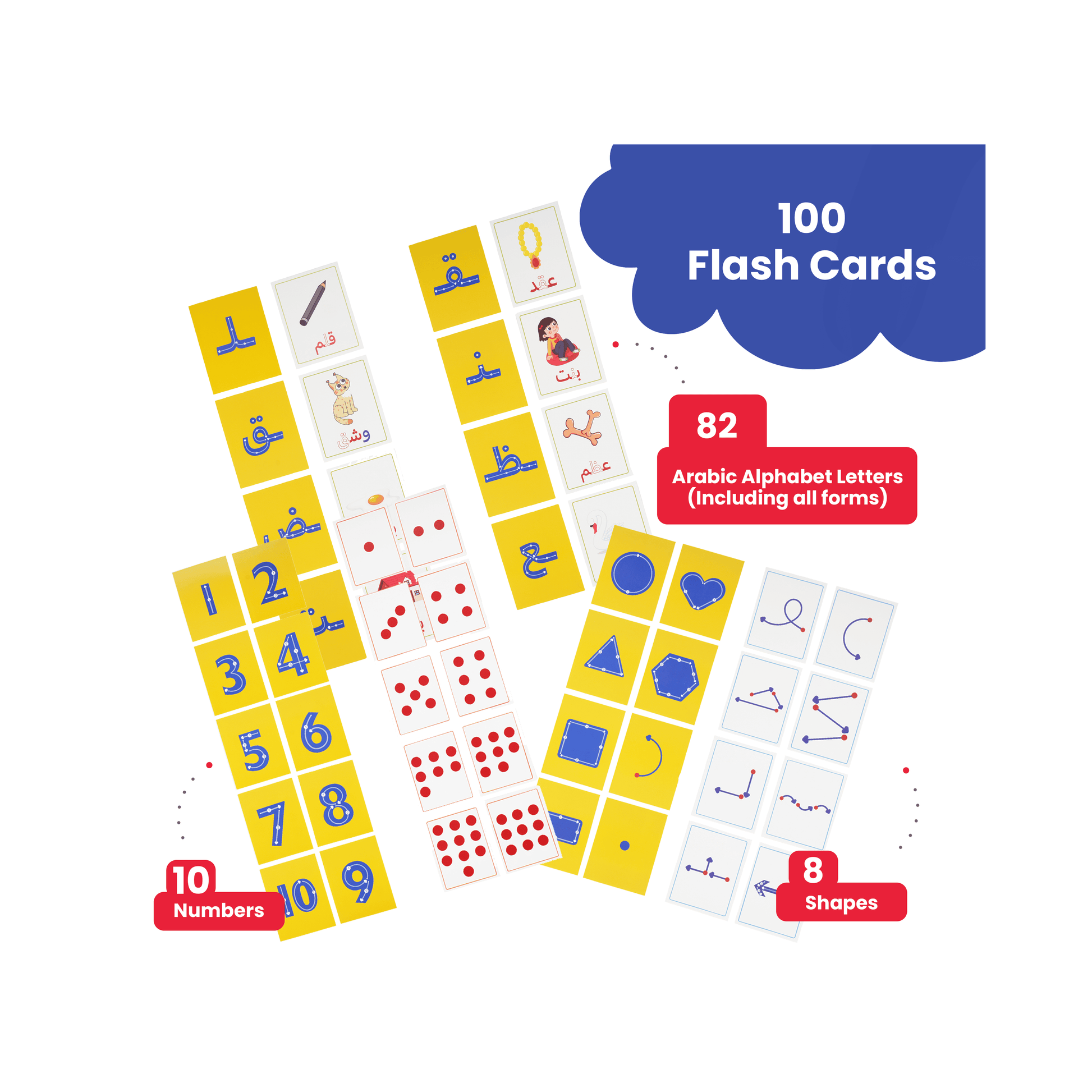 • Comprehensive Educational Set: With 100 flashcards, each featuring a letter, an associated word, and visuals for numbers and shapes, your child will learn the alphabet, how to draw basic shapes, and how to write and count numbers from 1 to 10